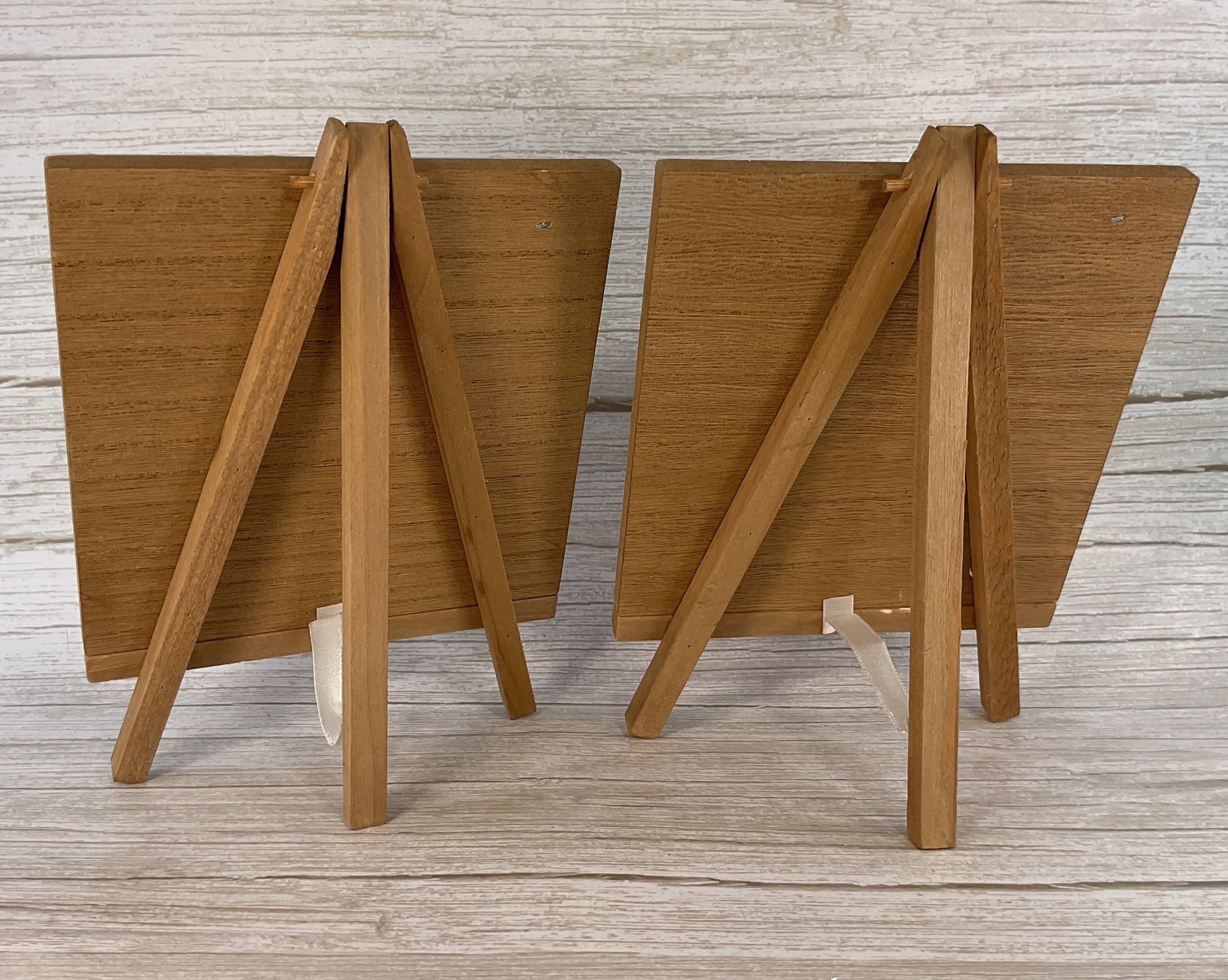 DETAILS: Wood, paper, paint/stain and vinyl construction. Easel back stand. See picture for details.
