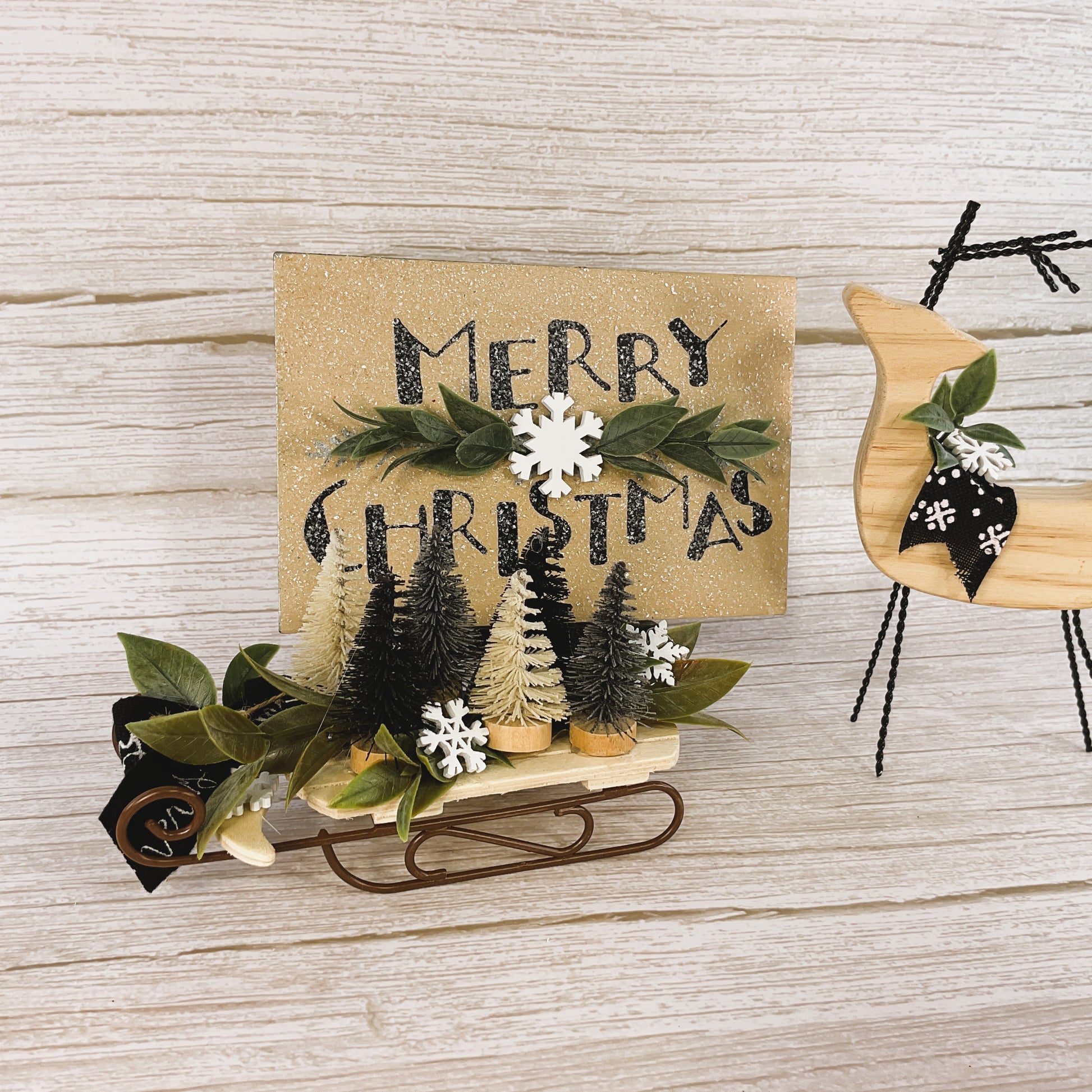 DETAILS: Wood and paint construction sled with sisal trees. Metal postcard with wood easel stand. Natural wood deer with metal legs. See picture for details.