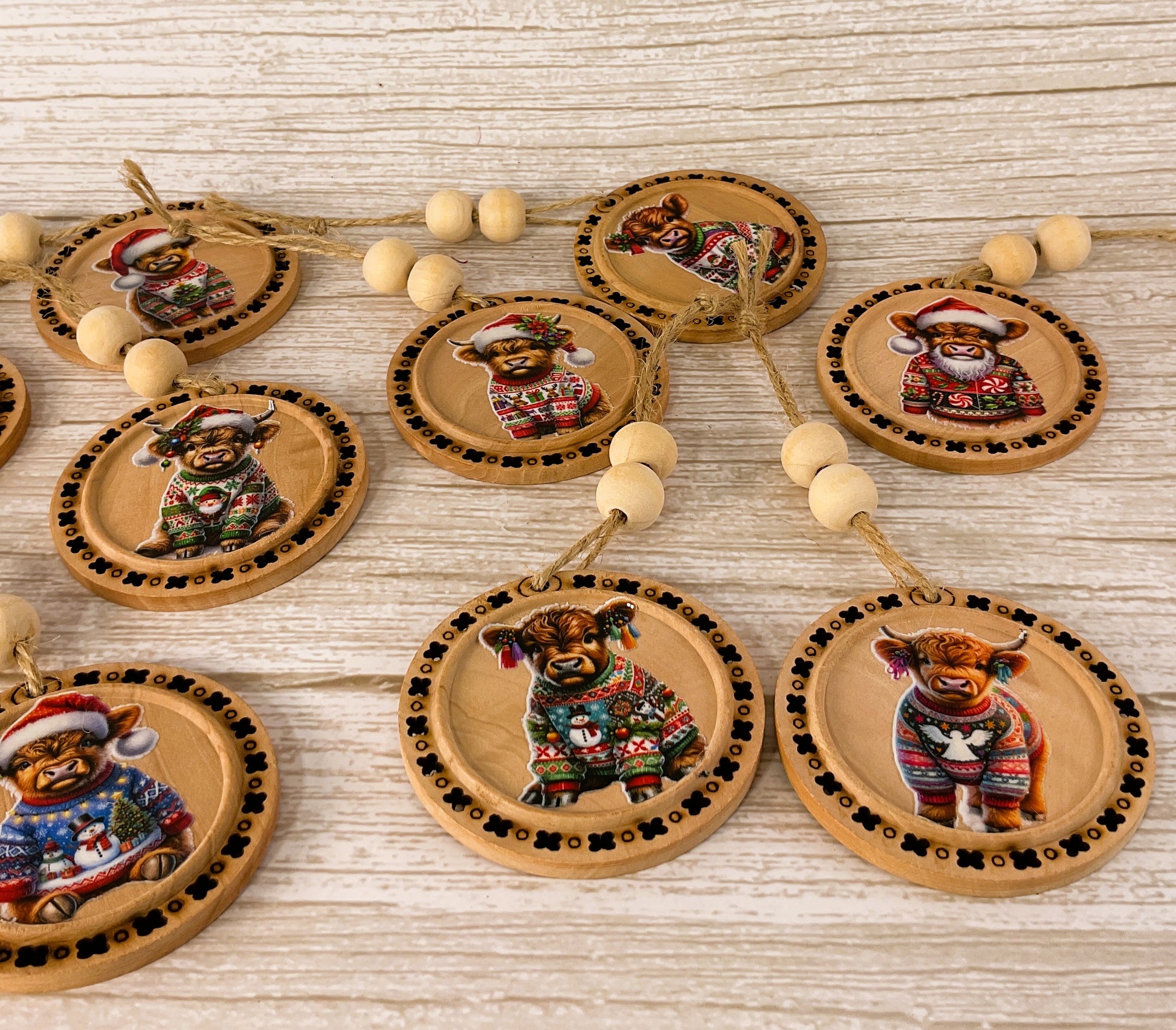 ITEM: Christmas Decor - Ugly Sweater Highland Cow Ornaments 10pc Set