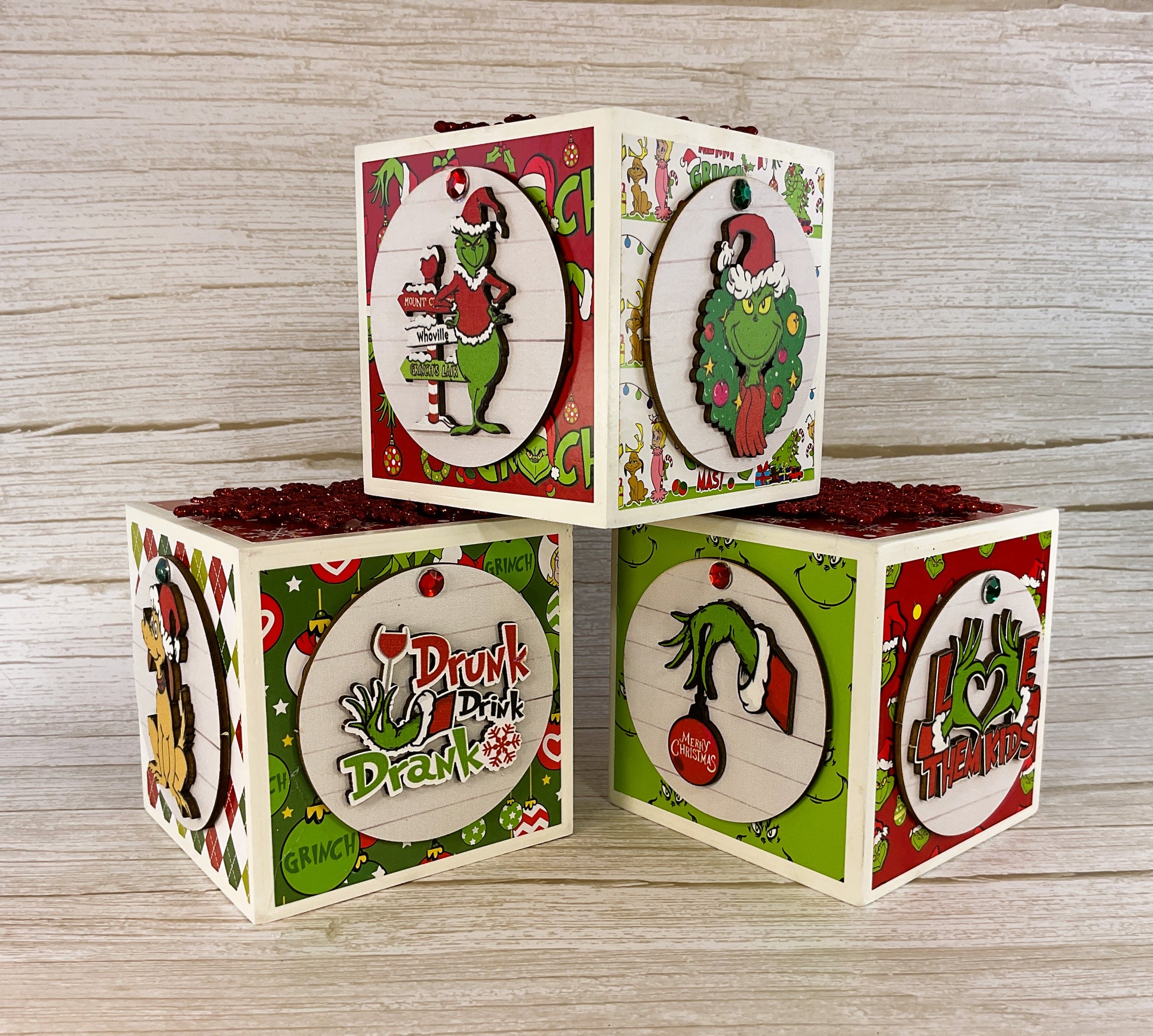 ITEM: Christmas Decor - Whimsy Green Blocks Ornament Snow-globe 4pc