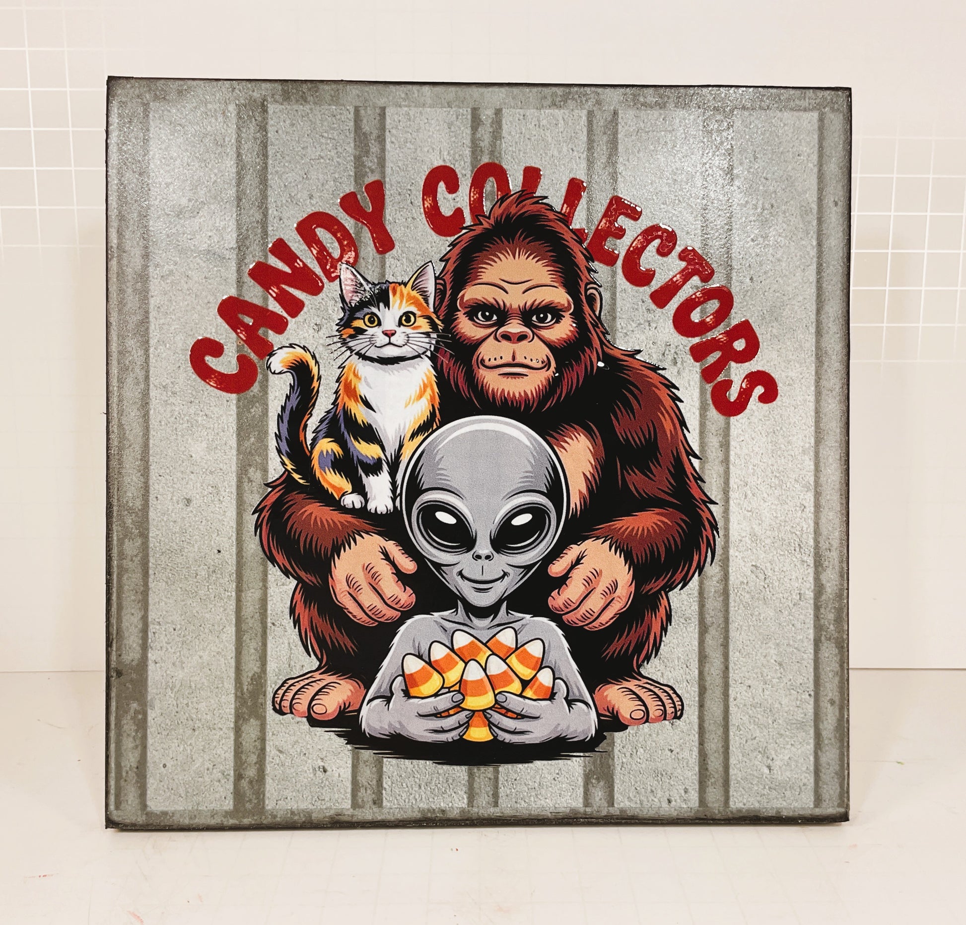 ITEM: Halloween Decor - Bigfoot Alien Candy Corn Tabletop Easel Sign