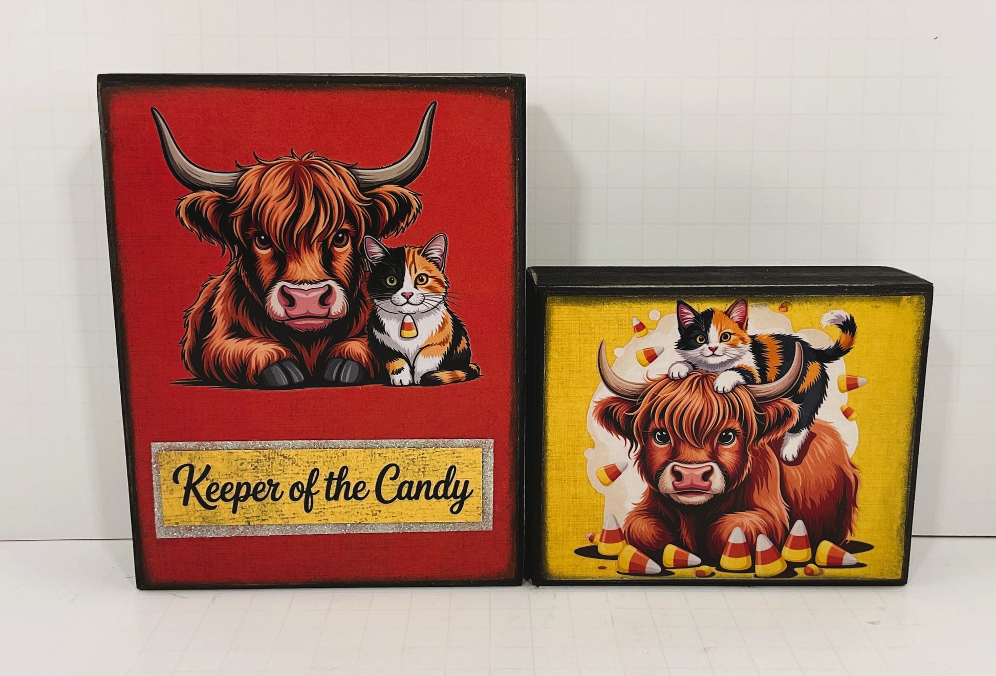 ITEM: Halloween Decor - Highland Cow Calico Cat Candy Corn Box Sign 2pc