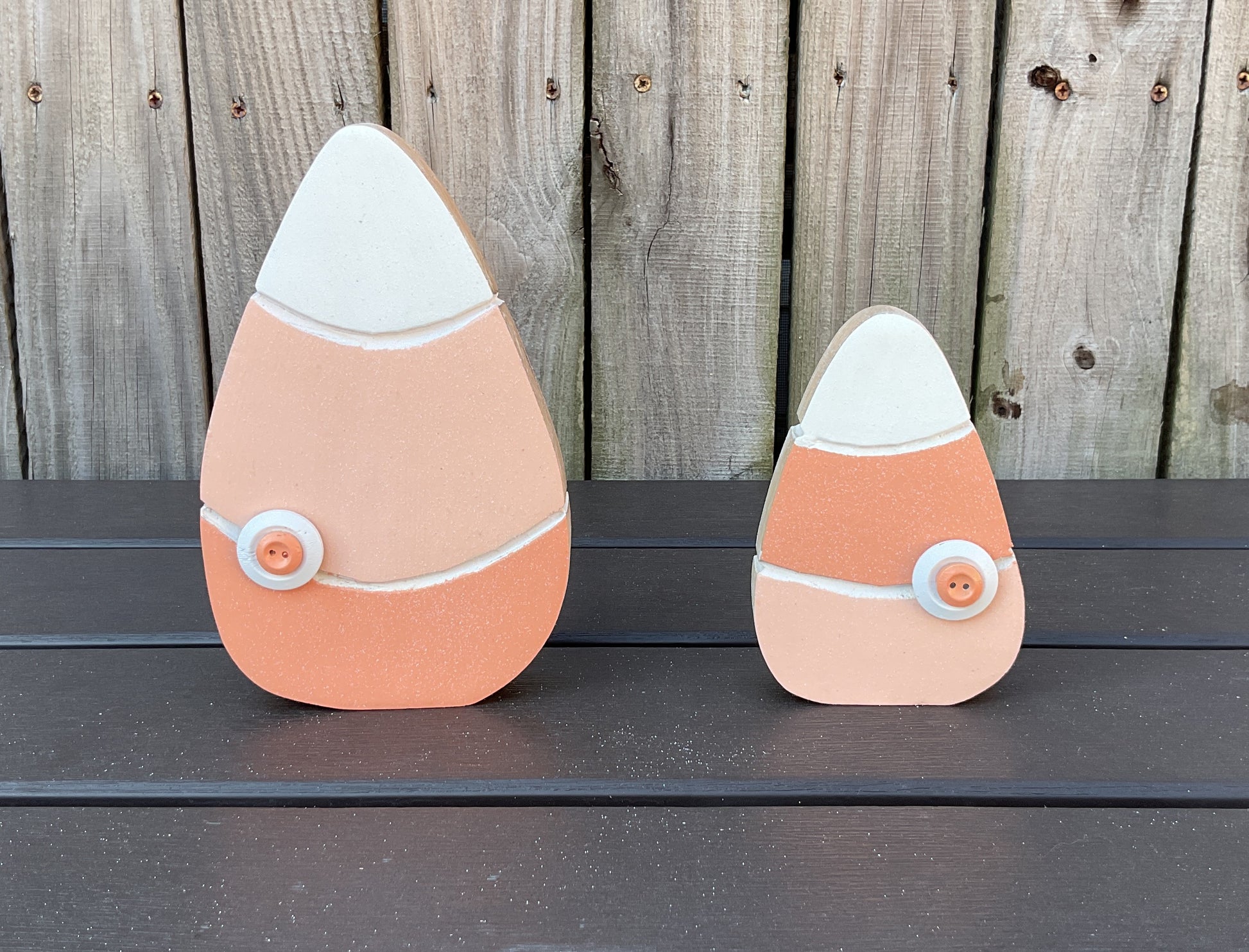 ITEM: Halloween Decor - Peach Pastel Chunky Wood Candy Corn Sitters 2pc Set