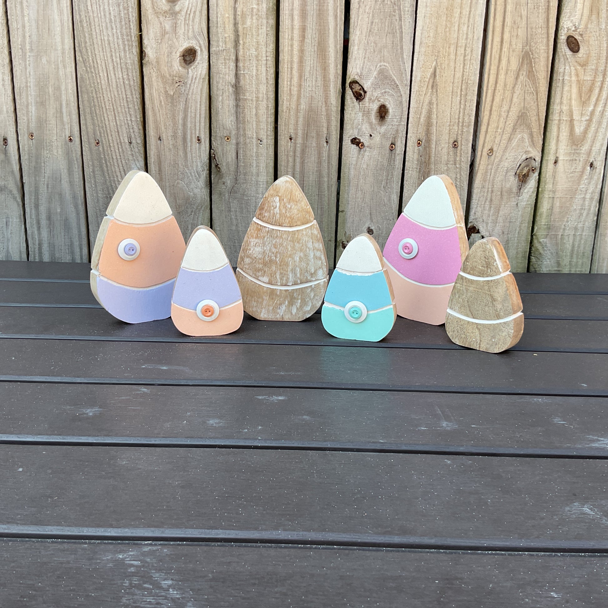 ITEM: Spring Decor - Pastel Purple Peach Chunky Wood Candy Corn Sitters 2pc Set