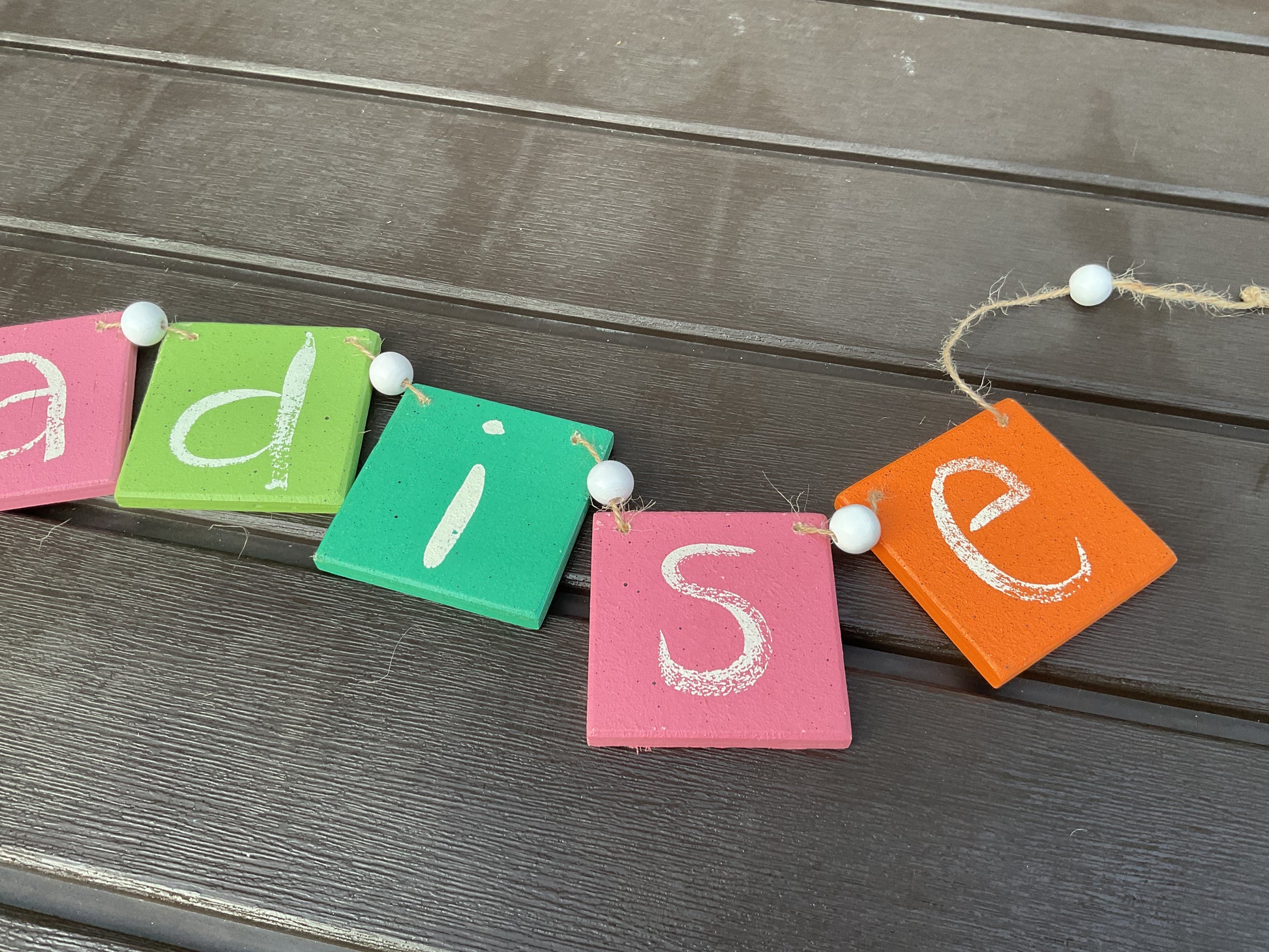DETAILS: Wood and/or mdf wood and paint/stain construction. Stenciled lettering wood banner tiles on twine cord with bead accents. See picture for details.