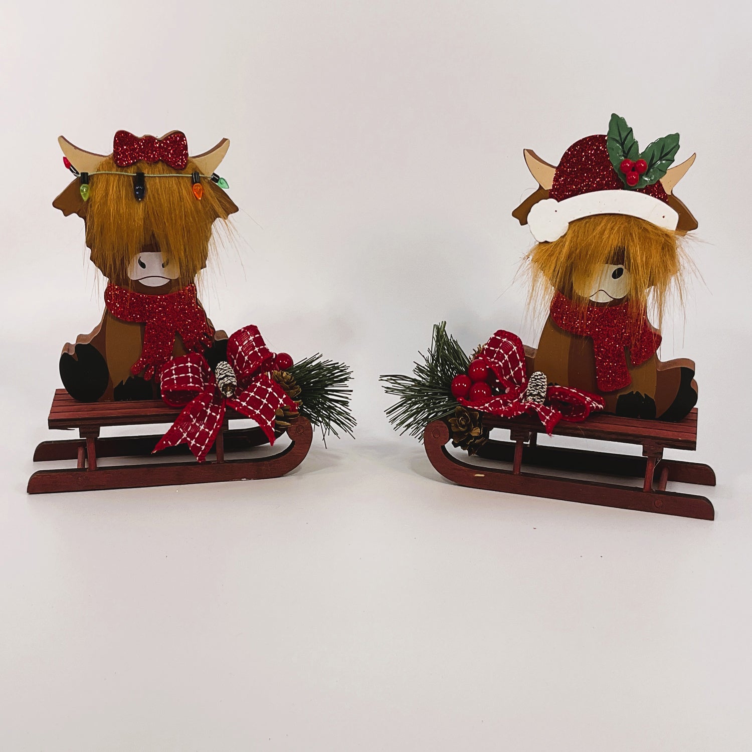 ITEM: Christmas Decor - Chunky Wood Highland Cow Reindeer and Sleds 2pc