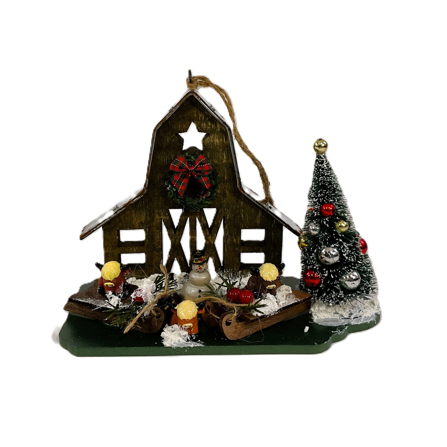 DETAILS: Metal roof, wood, paint/stain barn, with micro Highland Cows and tiny bottle brush trees. Finished with coordinating embellishments. Free-standing tabletop decor or can be used as an ornament. See picture for details.
