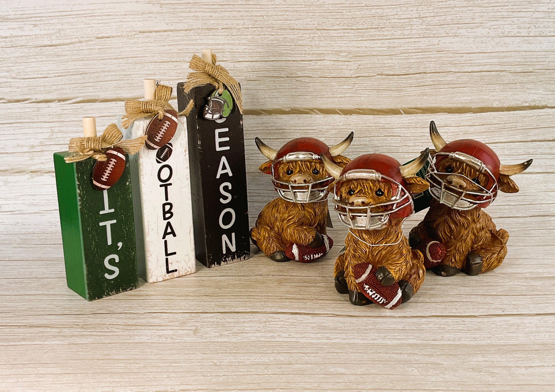 ITEM: Fall Decor - Football Highland Cow Tabletop Resin Figurines 6pc